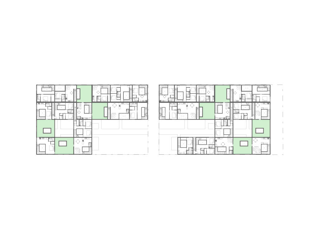 The residences located at the corner of Olive and North Taylor in the Central West End neighborhood of St. Louis provide each tenant with a private entrance and outdoor space. These amenities are typically not found in the urban condition but provide a sense of ownership was acheived with suburbia. This was achieved by creating a seires of bar buildings that were then aggragated to created outdoor terraces on the roof tops. The units are broken up into four typologies; studios, one-bedroom, two-bedroom, and live-work spaces and arranged on a 25ft by 25ft grid. The program for each unit is stacked vertically, essencially give each homeowner their own 25ft by 25ft plot.