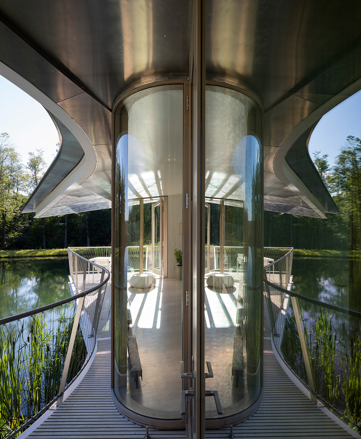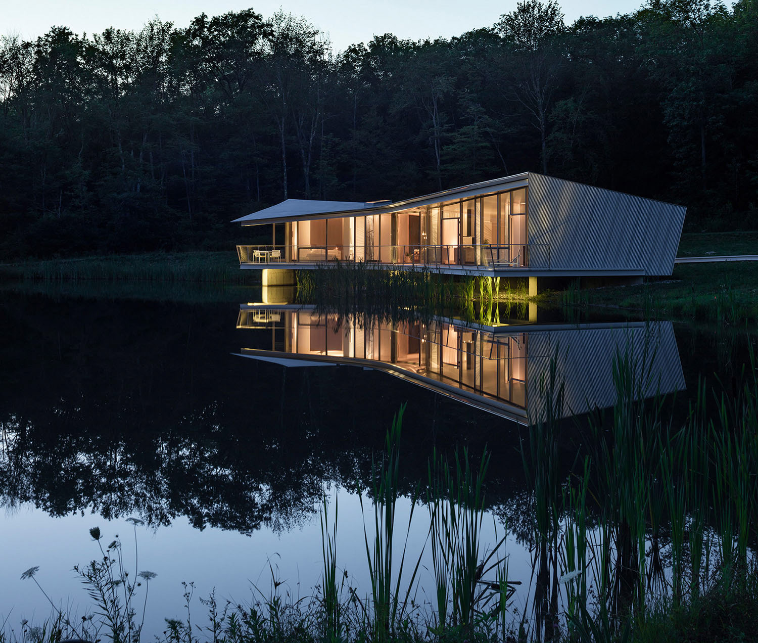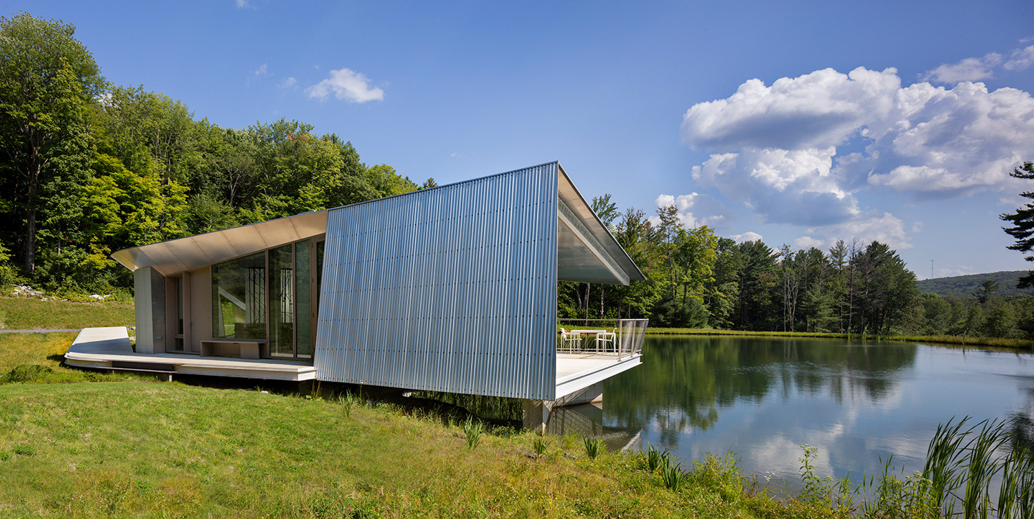 The site of Ephemeral Edge is a forested hillside which contains a constructed pond and overlooks a distant view. The design is informed by four site conditions: the curving edge of the pond, the torqued banks necessary to construct the pond, the spindly edge of the forest clearing, and the quiet beauty of the distant view. The pond reflects the ephemeral aspects of living here: the daily changes of light across its’ surface and the daily and seasonal fluctuations of temperature. The sweep of the pond’s edge joins seamlessly with the dynamic curvilinear roof and deck drawing these qualities inside the house. The twisted form of the house responds to the torqued banks of the pond, required to construct the flatness on a hillside. Together, the roof/wall condition mirrors the twist between lower filled bank and upper carved bank. The delicate forest edge becomes structure. Three planes of rebar emerge from the concrete foundation walls as slender steel trunks and branches that float the house float lightly above the water. The radial plan of skylight walls sequentially mark the passage of the sun over the course of the day—filling the intimate spaces of the house with the light and shadow of the forest. The pond and the distant view are always present in the house. At the entry, where the dining space aligns with the distant view, doors open through the house, joining the table to the larger landscape while occupying an intimate space.