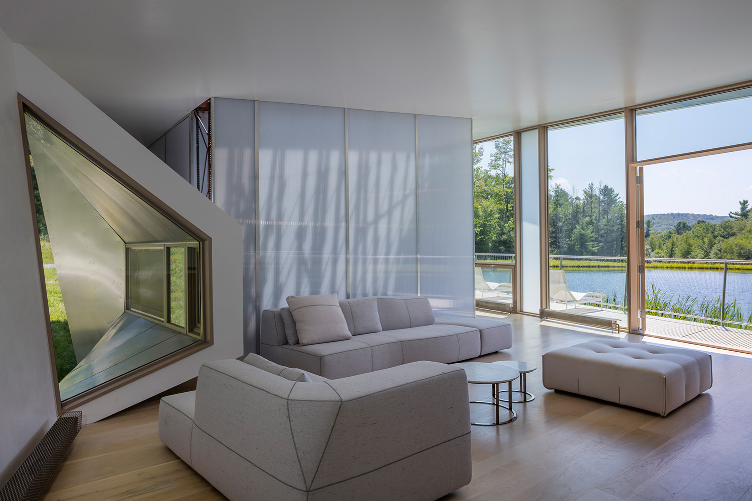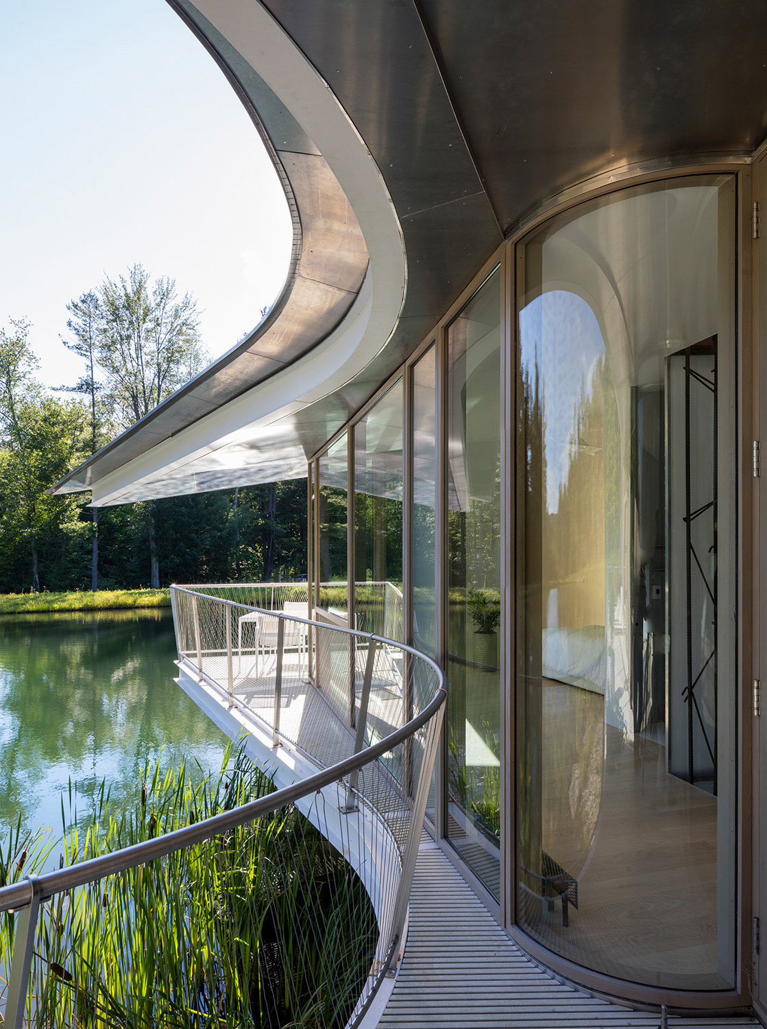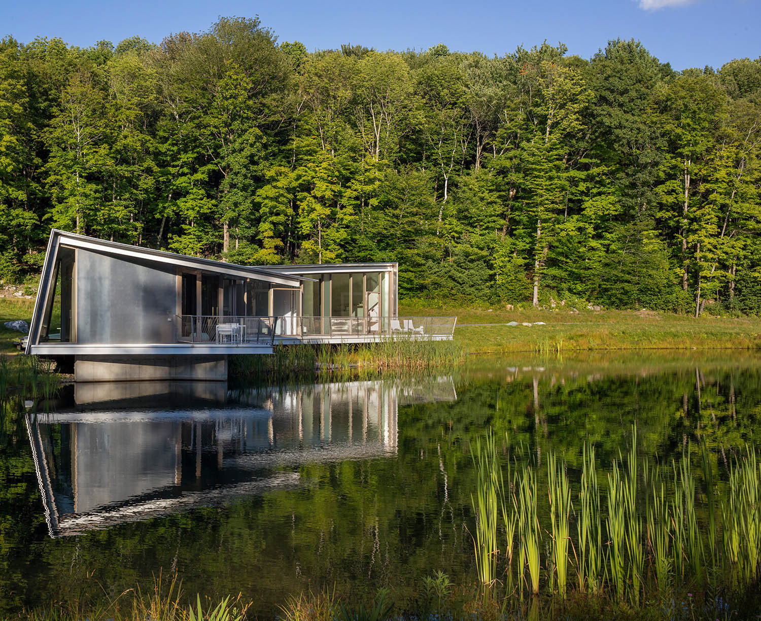 The site of Ephemeral Edge is a forested hillside which contains a constructed pond and overlooks a distant view. The design is informed by four site conditions: the curving edge of the pond, the torqued banks necessary to construct the pond, the spindly edge of the forest clearing, and the quiet beauty of the distant view. The pond reflects the ephemeral aspects of living here: the daily changes of light across its’ surface and the daily and seasonal fluctuations of temperature. The sweep of the pond’s edge joins seamlessly with the dynamic curvilinear roof and deck drawing these qualities inside the house. The twisted form of the house responds to the torqued banks of the pond, required to construct the flatness on a hillside. Together, the roof/wall condition mirrors the twist between lower filled bank and upper carved bank. The delicate forest edge becomes structure. Three planes of rebar emerge from the concrete foundation walls as slender steel trunks and branches that float the house float lightly above the water. The radial plan of skylight walls sequentially mark the passage of the sun over the course of the day—filling the intimate spaces of the house with the light and shadow of the forest. The pond and the distant view are always present in the house. At the entry, where the dining space aligns with the distant view, doors open through the house, joining the table to the larger landscape while occupying an intimate space.