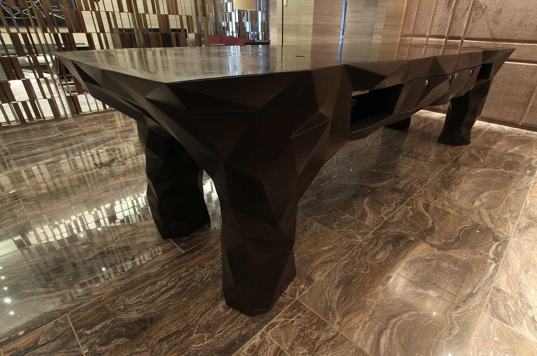 In terms of process, the core of the desks is a CNC-milled polyurethane foam with an internal welded aluminum frame. The foam was then coated with a 1/2 inch-thick layer of a machinable resin and then CNC-milled a second time with the final faceted geometry, resulting in a 1/4 inch-thick resin hardcoat. The desks were then coated with a thin layer of composite spray-on steel and finished with a black patina.