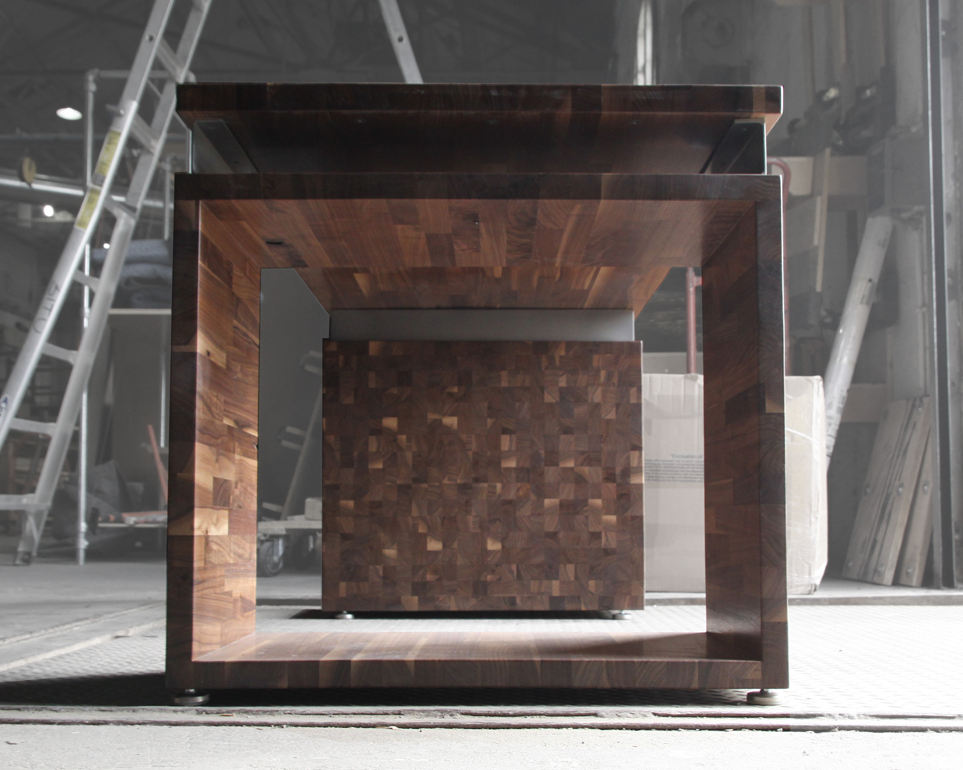 Thinking Block was a process driven project that began when I wanted to re-purpose scraps that were discarded.The scraps were oddly shaped requiring that they had to be cut down to a more standard dimension. I decided to go with the standard section size and let the length be the variable and use the process of butcher blocking to create larger surfaces. The material and process allowed me to create complex surface patterns while keeping the form simple and functionality of the desk intact.
